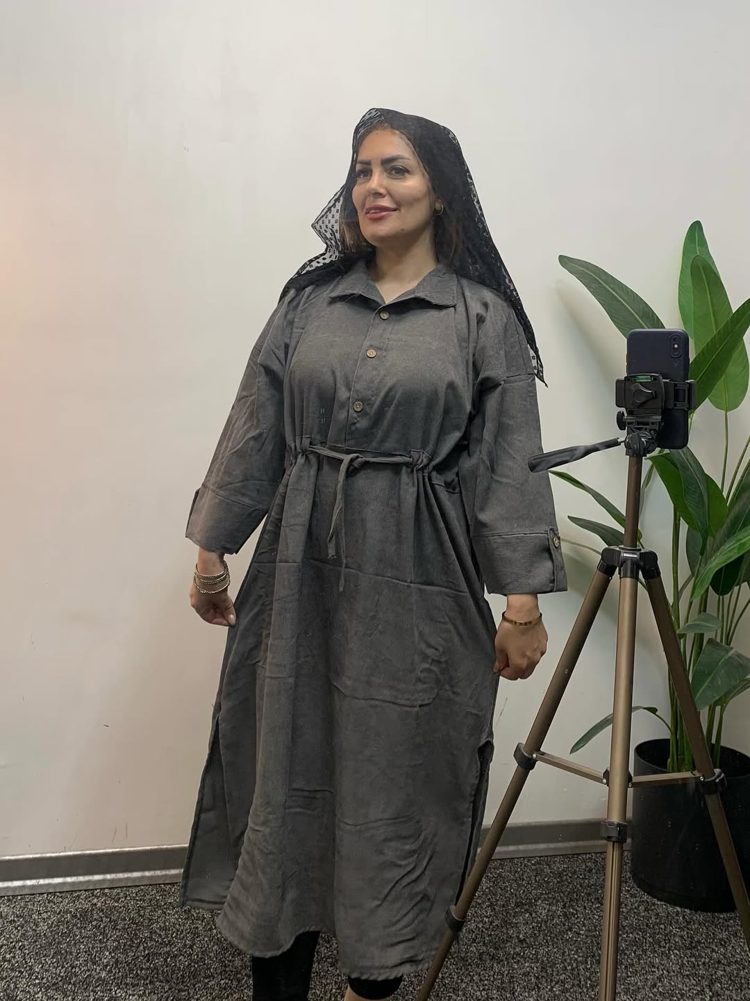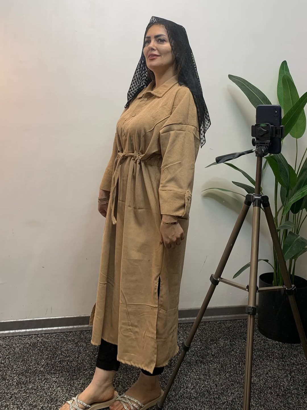 کفتان مانتویی با قد ۱۲۵ سانت و چاک از دو طرف. دور سینه ۱۴۰ سانت و دور باسن ۱۴۲ سانت. قد آستین از یقه تا مچ ۷۰ سانت و دور بازو ۶۰ سانت. در رنگهای سرخابی، کرم، مشکی، سورمهای، موکا، سبز و توسی.