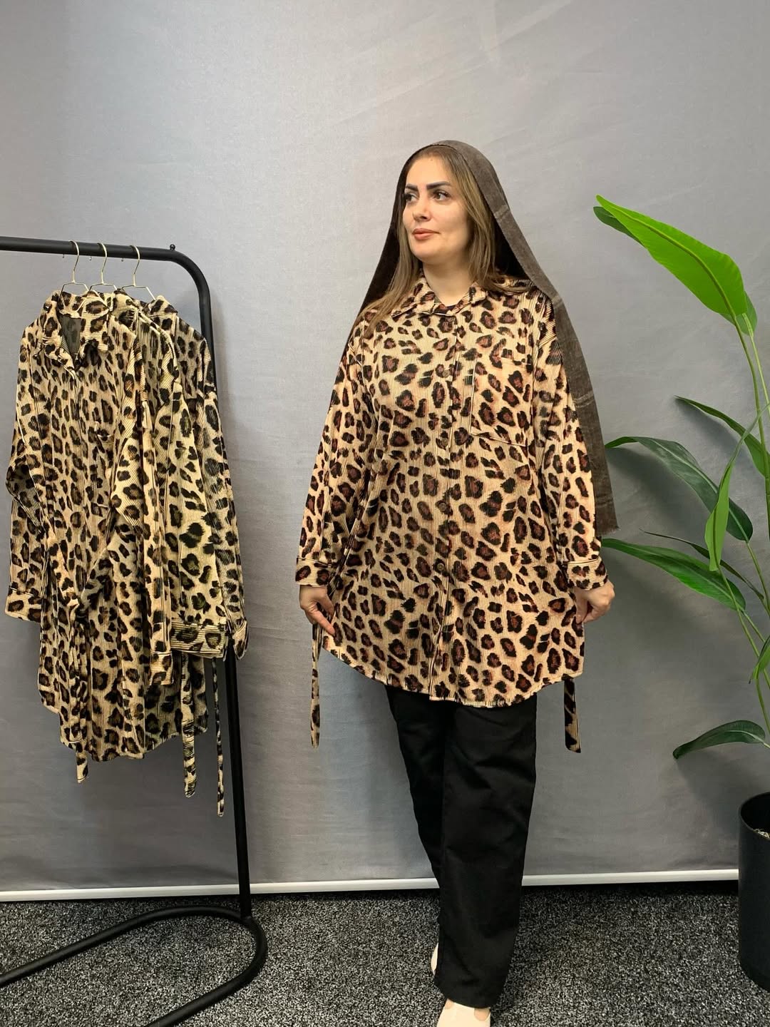 شومیز مانتویی پلنگی با پارچه پلیسه ی زیکو سایز بزرگ