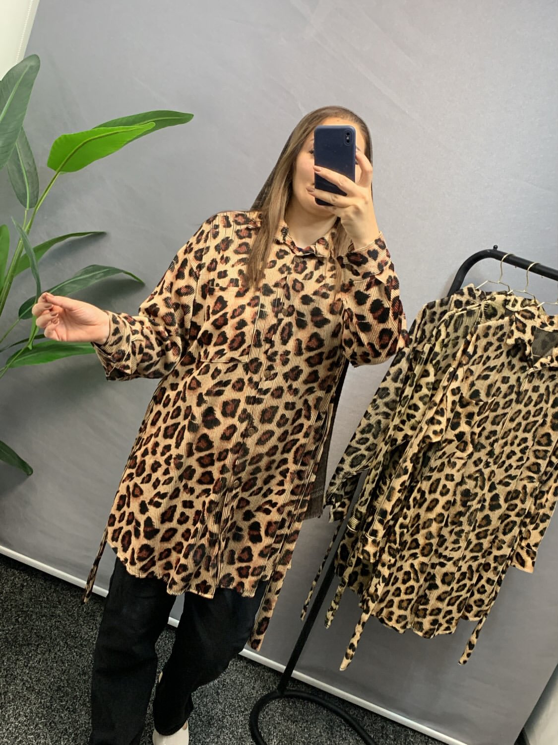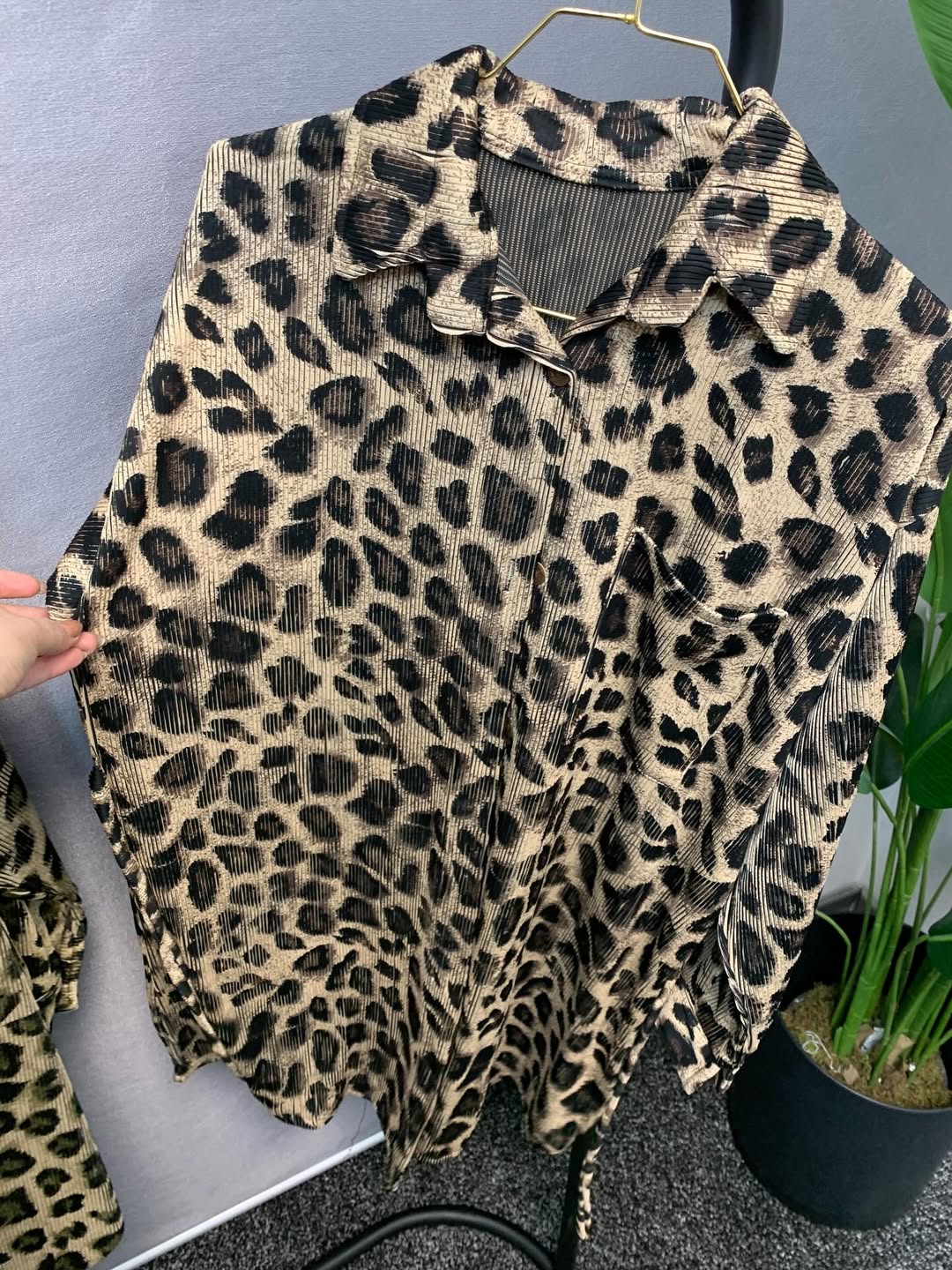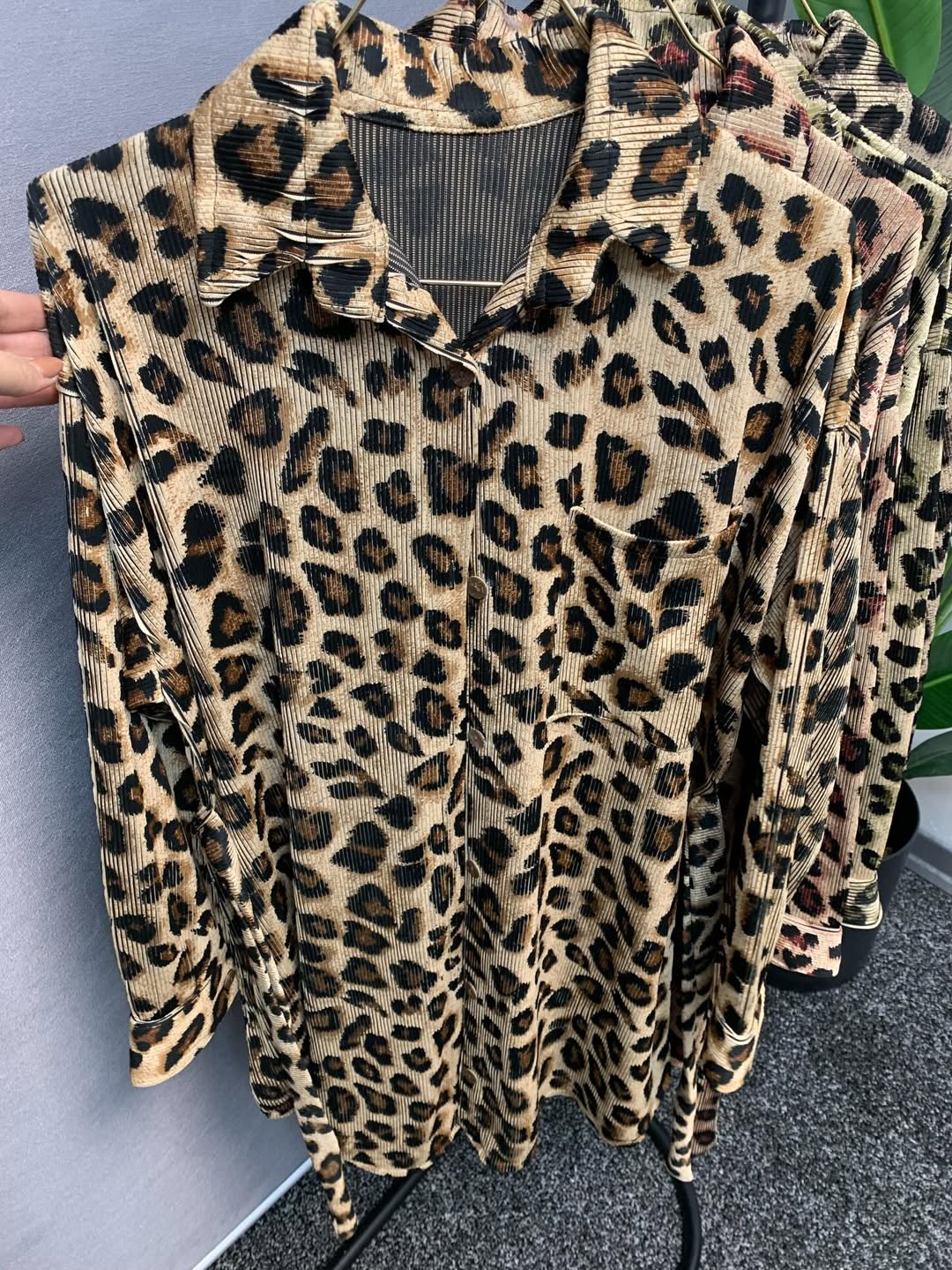 شومیز مانتویی پلنگی با پارچه پلیسه ی زیکو که الان ترند شده و قد ۹۰ سانت دارد. سایز ۴۴/۴۶ تا ۵۲/۵۴. بند تنظیم سایز دارد.