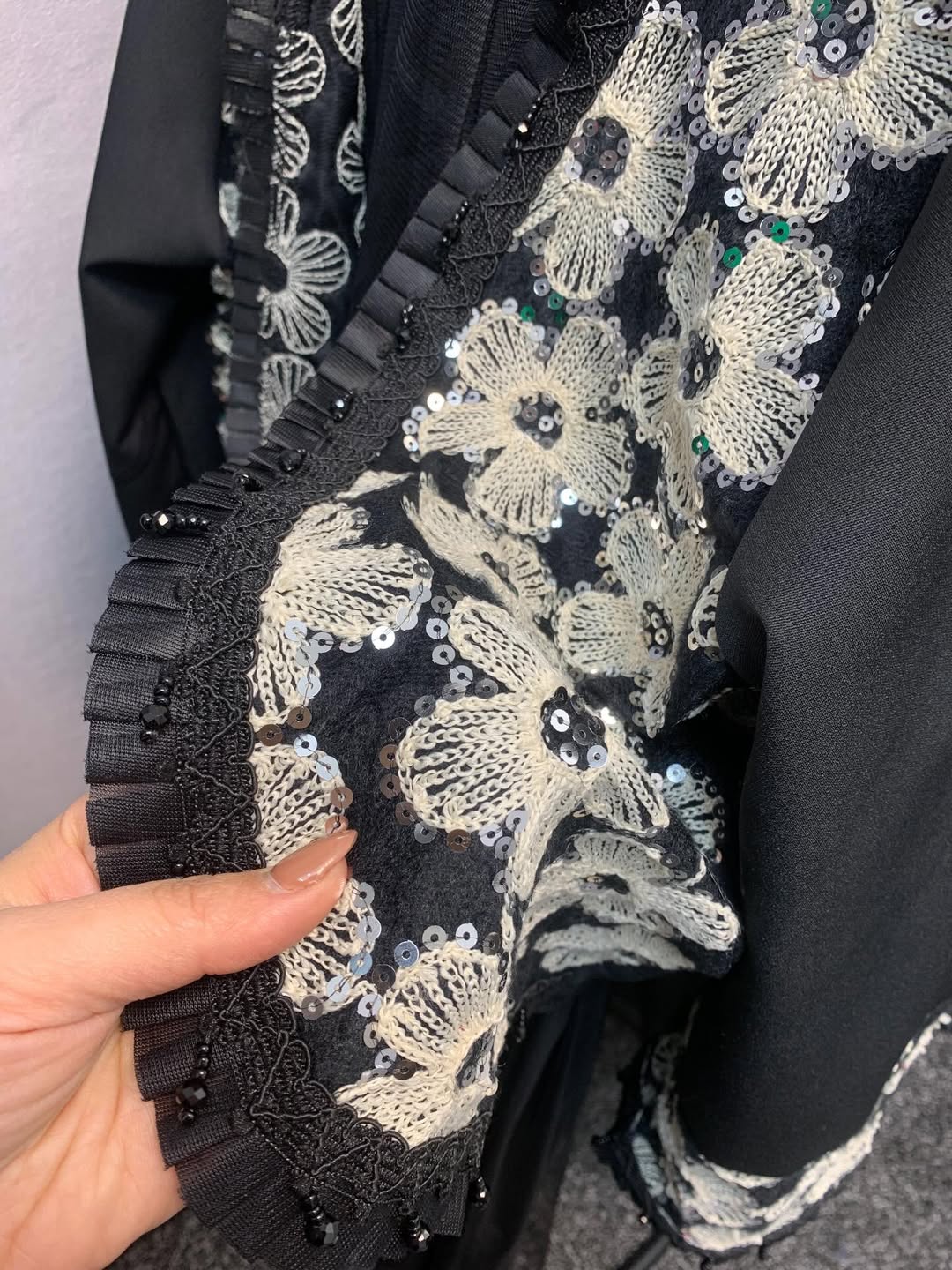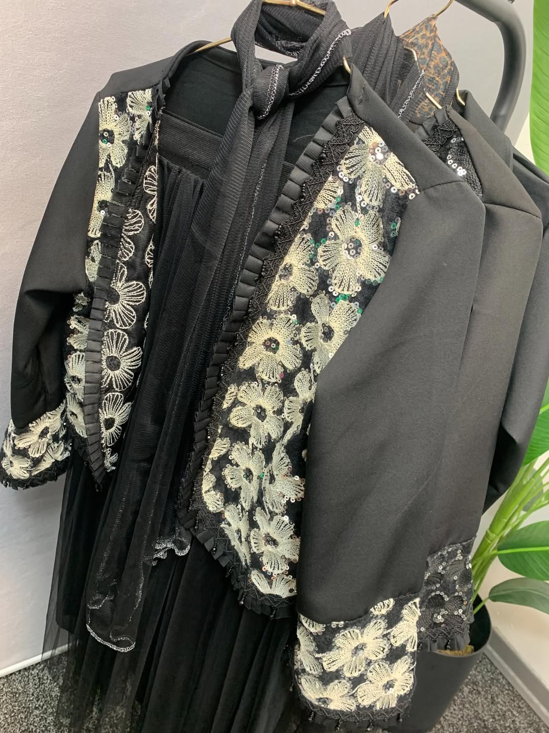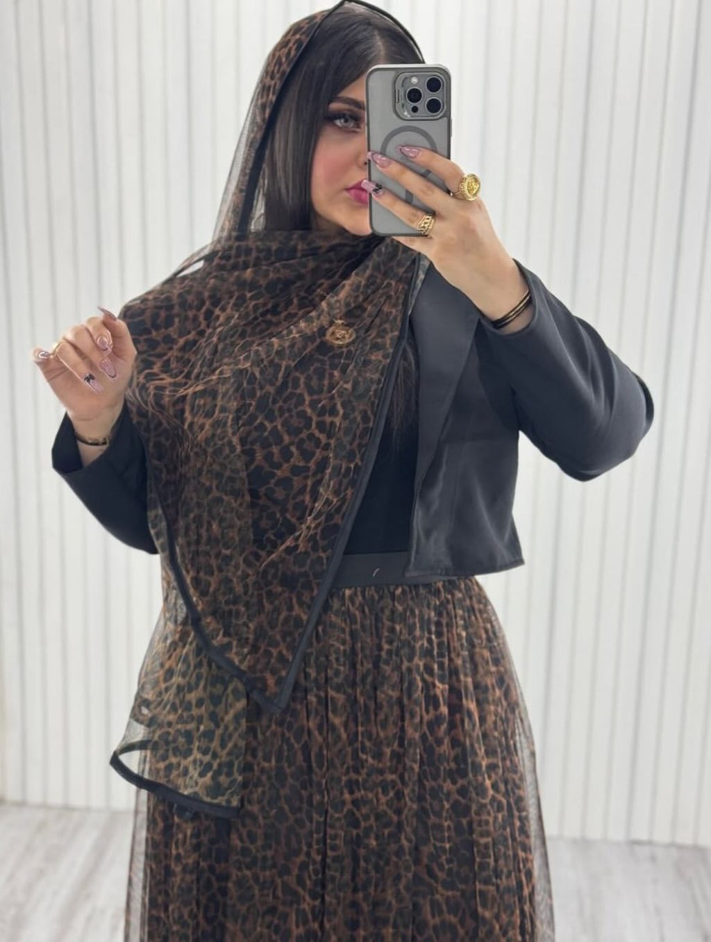 ست سه تیکه کت دامن شامل شال پلنگی با جنس مازراتی و حریر. قد، سایز و دیگر جزئیات مشخص شده است.