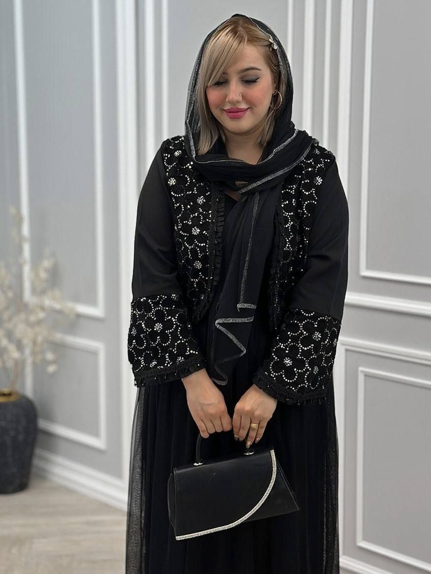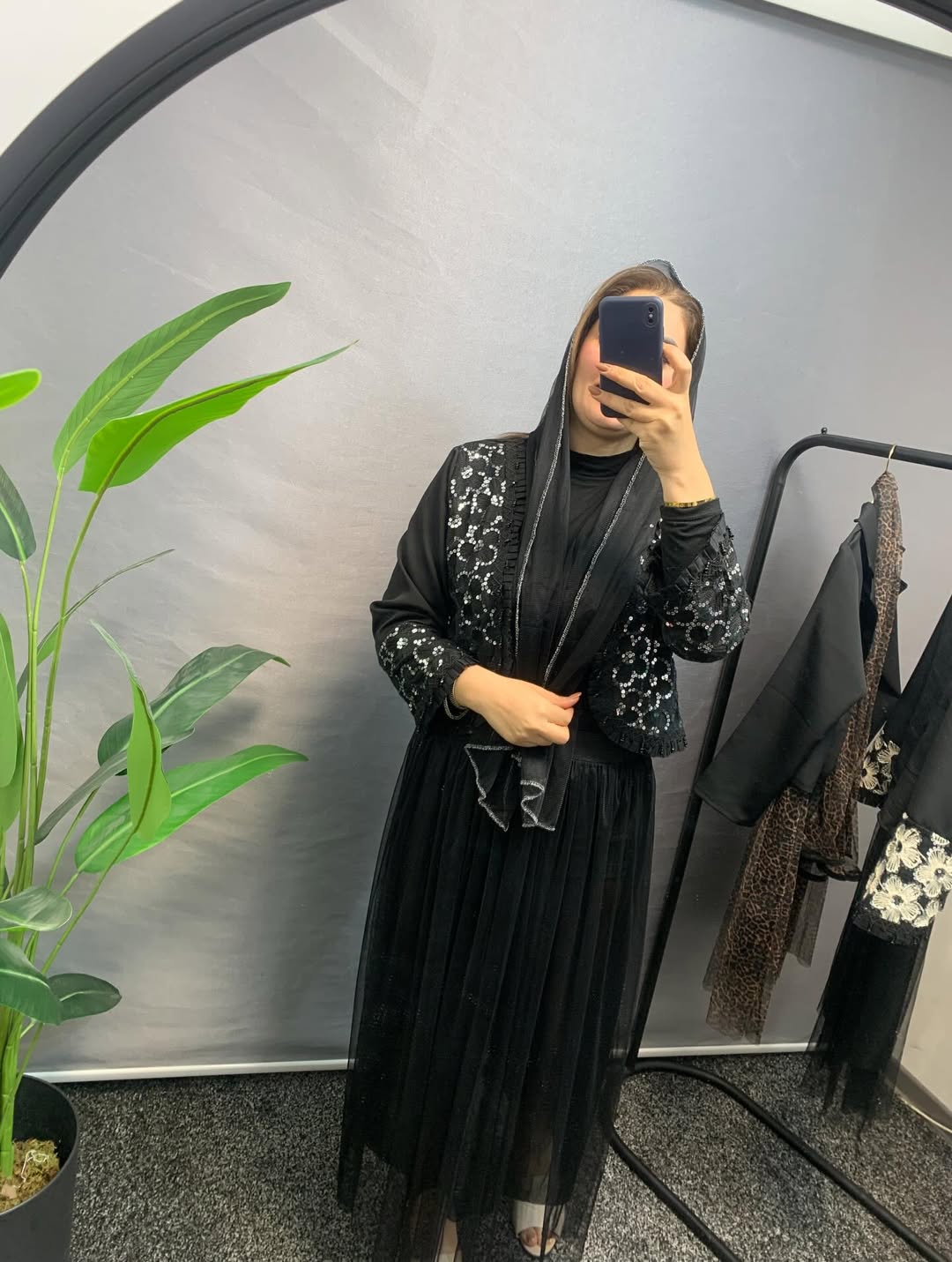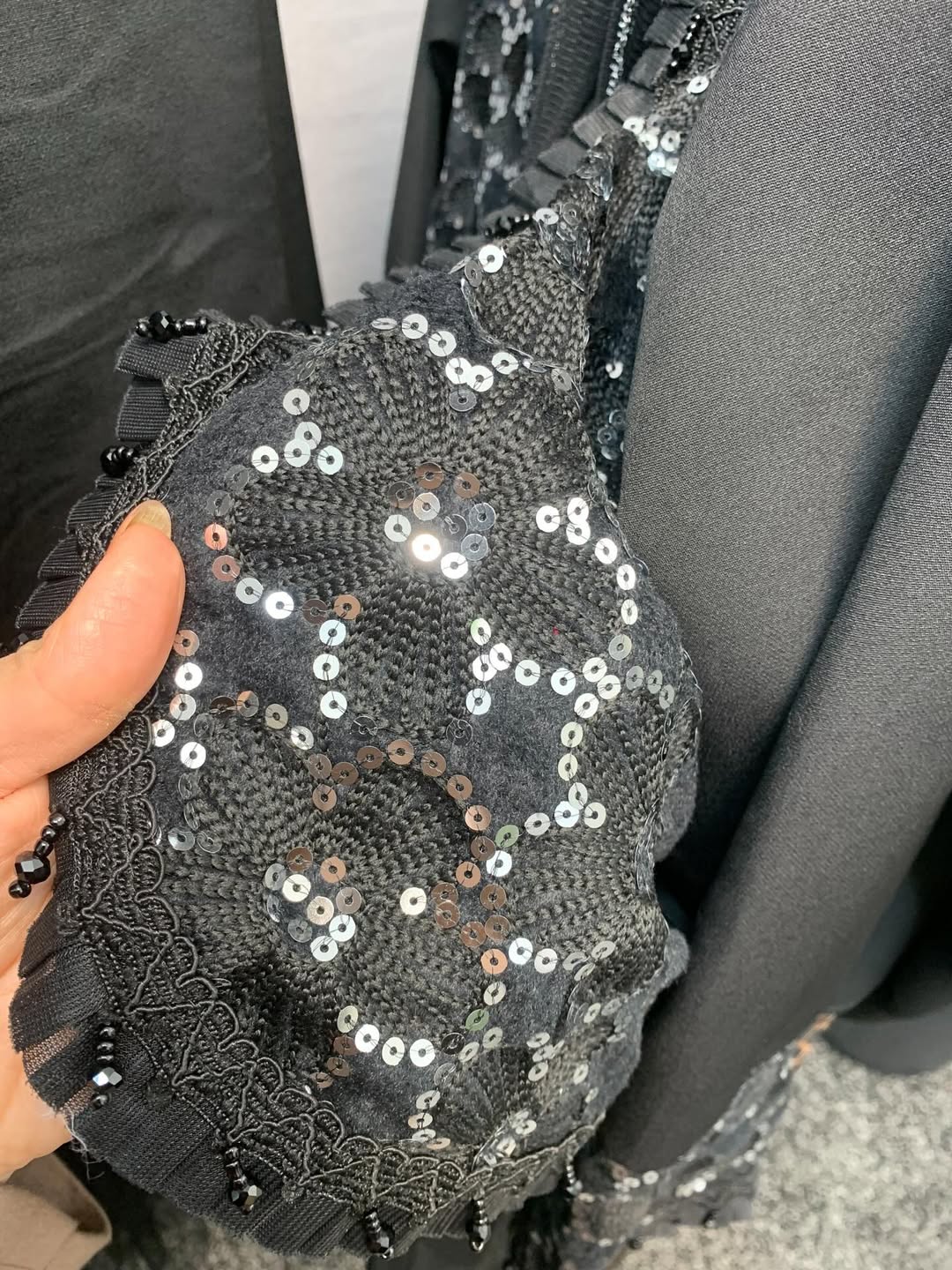 ست سه تیکه کت دامن شامل شال پلنگی با جنس مازراتی و حریر. قد، سایز و دیگر جزئیات مشخص شده است.